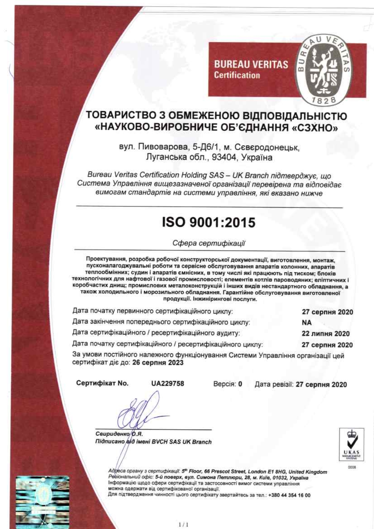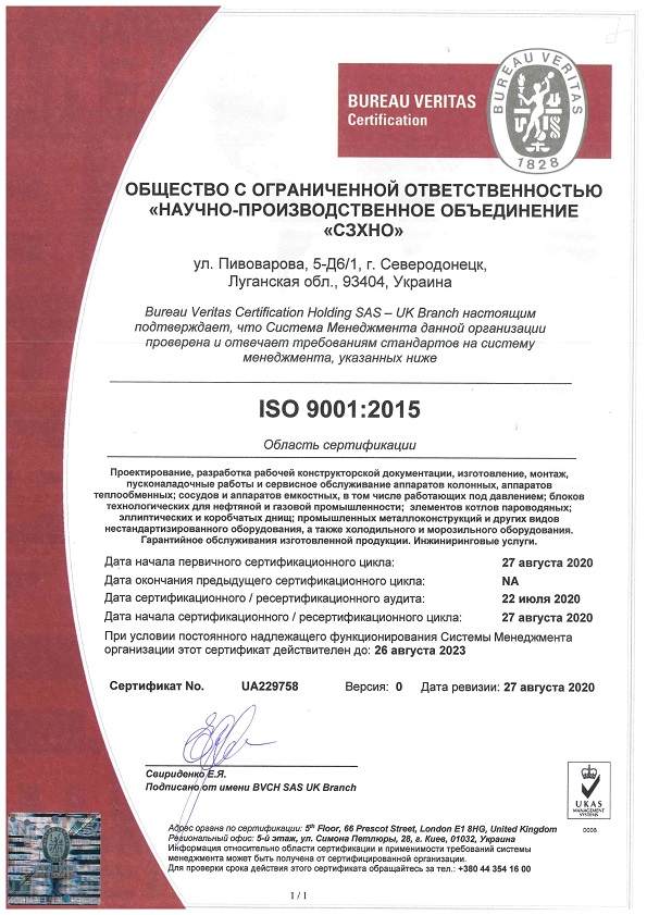 В августе 2020 года система менеджмента качества "ООО"НПО"СЗХНО" прошла ресертификацию на соответствие требованиям международного стандарта ISO 9001:2015, сертификат выдан организацией BUREAU VERITAS.